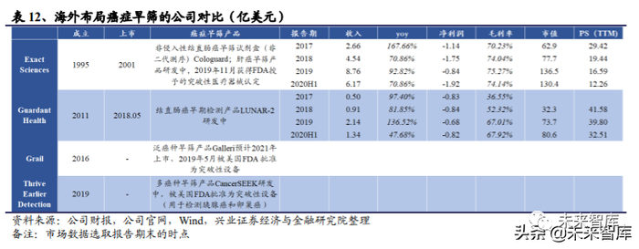 肿瘤早筛和伴随诊断是基因测序行业中最为活跃的方向,近年来海外融资、并购、 上市不断,体现出海外市场对该领域的持续关注。本文中我们重点选取了几家成 立较早、布局癌症早筛领域的企业进行介绍(汇总对比见表 12),其中 Exact Sciences 推出全球首个获得 FDA 批准的结直肠癌早筛产品,其肝癌早筛检测也 在 2019 年 11 月获得 FDA 授予的突破性医疗设备认定;Guardant Health 结直肠癌 早筛检测 LUNEAR-2 仍在研发中。GRAIL 是背靠 Illumina 的液体活检新公司, 成立于 2016 年,已于今年 9 月提交 IPO,其泛癌种早筛产品预计于 2021 年以 LDT 的形式上市,2019 年 5 月已被美国 FDA 批准为突破性设备。Thrive Earlier Detection 的 CancerSEEK 通过对血液中与癌症相关的 ctDNA 基因突变和蛋白质进行检测实现多癌早筛,也已获得美国 FDA 授予的突破性医疗器械认定。从公司的 成长性和盈利情况来说,目前这些公司成立时间相对较短,营收增速较快,近几 年增速均值超 100%,但由于上游仪器商垄断、高昂的研发投入、较高的营销费用 等因素,同期净利润普遍为负。