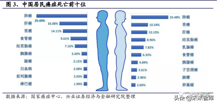 癌症是中国居民死亡的首要原因。《柳叶刀》2018 年发布的《1990-2017 年中国及 其各省死亡率、发病率和危险因素》的研究报告显示,2017 年中国人死亡的前十 五大原因分别是,中风、缺血性心脏病、肺癌、慢性阻塞性肺病、肝癌、道路交 通伤害、胃癌、阿尔茨海默症、新生儿疾病、高血压性心脏病、食道癌、下呼吸 道感染、自杀、肝硬化及其他慢性肝病和结直肠癌。尽管因分癌种统计使得因癌 症死亡人数较为分散,但可以看出,仅国内死亡人数前五的癌症(肺癌、肝癌、 胃癌、食道癌和结直肠癌)死亡人数总和已经超过中风。