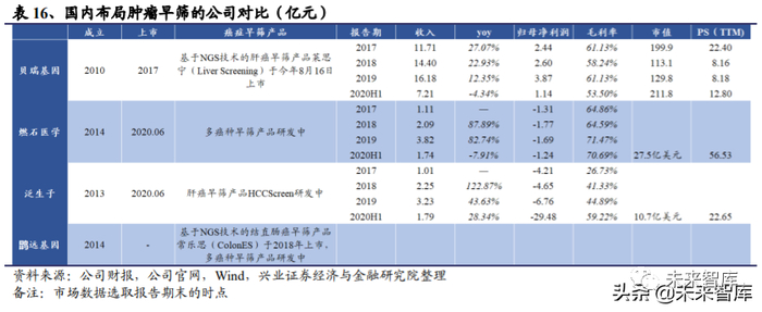 肿瘤早筛和伴随诊断是基因测序行业中最为活跃的方向,近年来海外融资、并购 不断,国内企业也在紧跟海外步伐快速发展。本文中重点介绍了国内癌症早筛领 域的领先企业(汇总对比见表 16),其中贝瑞基因基于 NGS 技术开发的肝癌早筛 产品莱思宁已于今年 8 月 16 日上市,未来先发优势明显;燃石医学开发的基于 ctDNA 甲基化的泛癌种早筛技术与 GRAIL 的产品和技术路线高度相似,GRAIL 的泛癌种早期检测已经于 2019 年 5 月被美国 FDA 批准为突破性设备;泛生子 也在正在快速推进其肝细胞癌早筛产品 HCCScreen 的研发和 NMPA 注册申报;作 为非上市公司,鹍远基因在基于 ctDNA 甲基化检测的癌症早筛领域成绩不俗,推 出结直肠癌早筛产品常乐思,多癌种早筛技术 PanSeer 正在研发中。