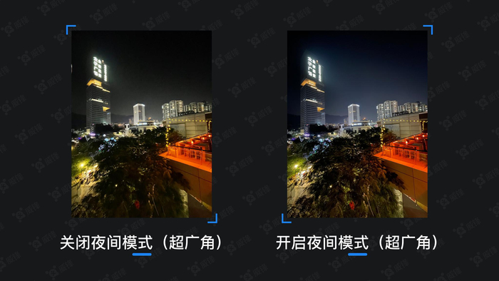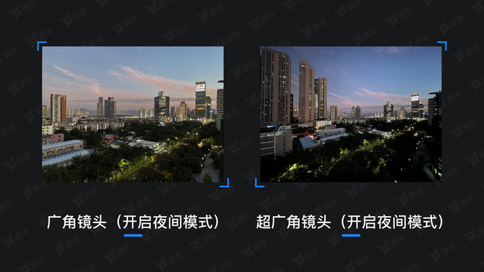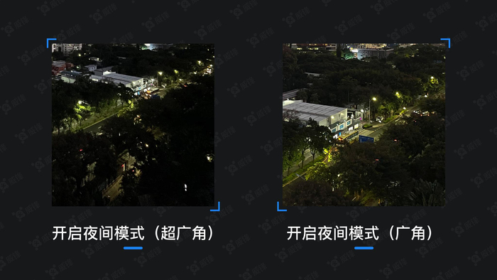 在夜间场景下,可以从上面的对比样张看出,无论是建筑物细节的保留,还是画面噪点的控制和明亮度还原,开启夜间模式后超广角镜头的表现都更加优秀。这是因为相比此前不支持夜间模式时的单帧记录,开启夜间模式后,超广角镜头会同时拍摄多帧素材进行合成,“计算”出一张细节更多、噪点更少、白平衡更准确的照片。