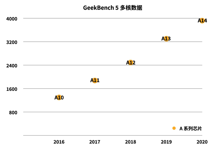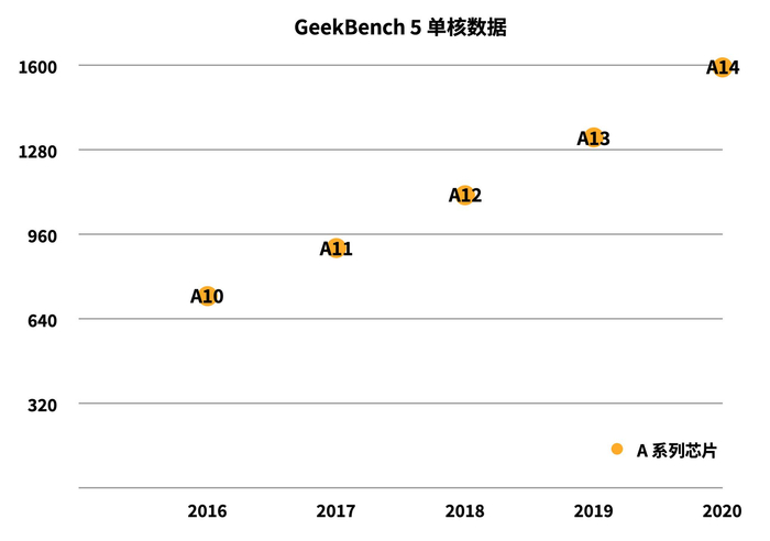 这也基本符合 A 系列芯片的演进路线,放眼近五代产品,从 2016 年的 A10 开始,一直到今年的 A14,无论是单核还是多核,隔代升级所带来的提升都比较平稳,那种“牙膏一管子挤爆”的情况比较罕见。