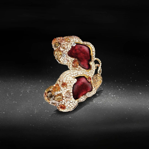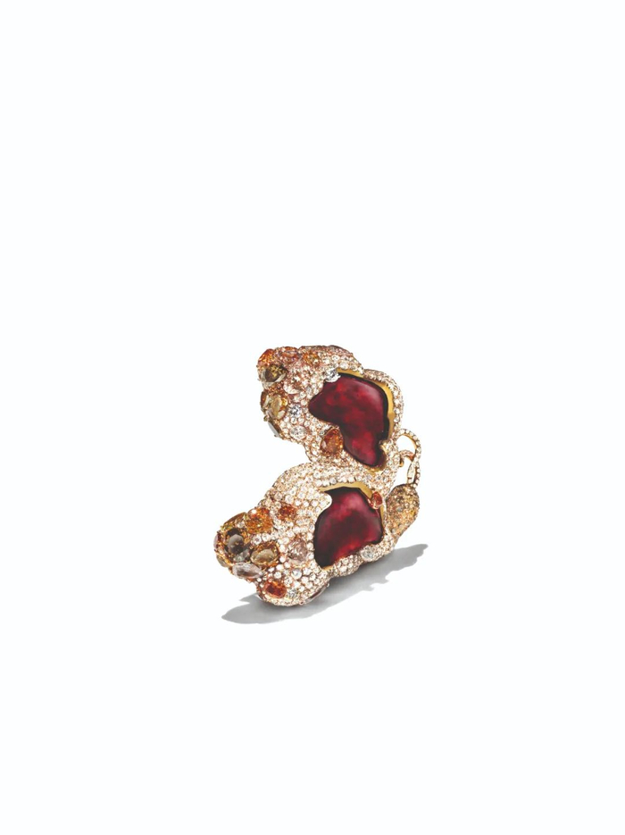 这样的艺术珠宝兼具艺术性、稀缺性、便携性,对于藏家而言,是投资的优质标的,也一直是高级拍卖中的热门品类。2012年,在日内瓦佳士得拍卖会上,“重生蝴蝶胸针”以估价的五倍、近百万美元的价格落槌价成交。2013年,8.03克拉红烧鸽血红宝石戒指以384万美元落槌,刷新当时亚洲当代艺术珠宝拍卖记录。