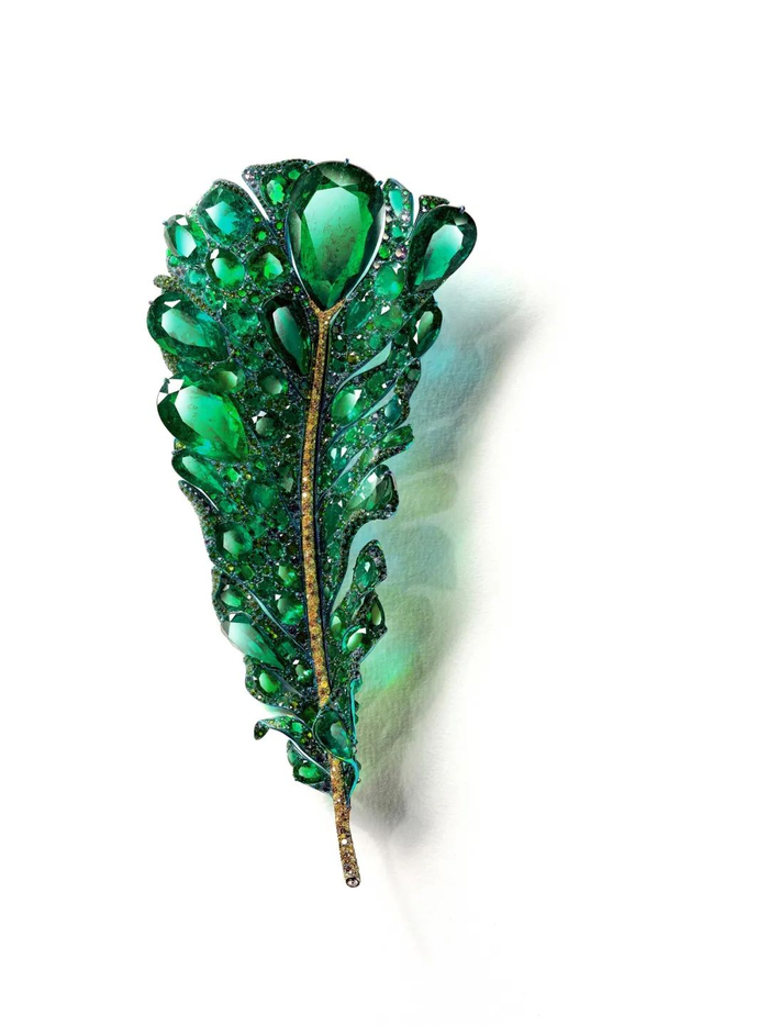 因此,Cindy Chao很早就开始在设计中添加新型金属——钛,使得作品呈现艺术线条和轻盈的触感。在冬叶套链的制作中,欧洲的钛金属师对照Cindy Chao雕塑的蜡模,以锻铸的方式,一比一手工打造而成。整件作品镶有约总计240克拉的6000多颗钻石,但重量仅有78克。今年全新发布的Black Label大师系列MasterpieceII - 无惧的羽毛胸针,也是采用钛金属的工艺,运用了17颗从1克拉到30克拉,各式哥伦比亚祖母绿作为主石,从下到上分别镶嵌于羽翼前后端。作品长达15.5公分,重量却仅有48克,宛如真实翎羽般轻盈。