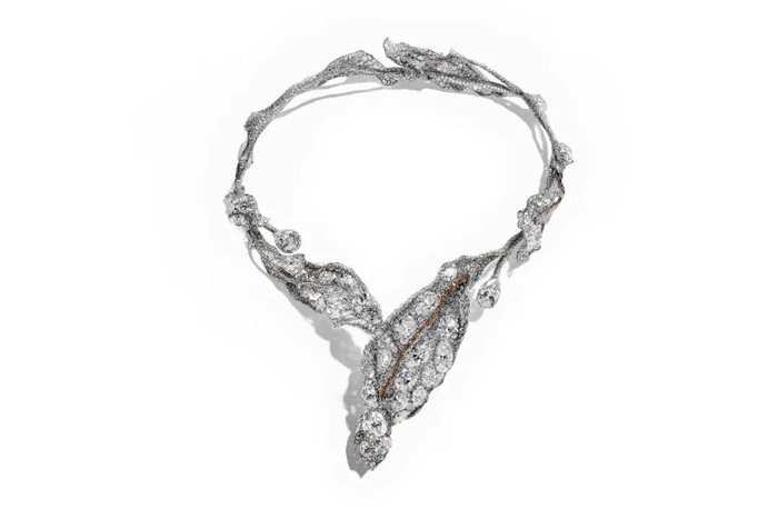 冬叶套链首次曝光于2016年的巴黎古董双年展,以脉络为题,用224颗黄钻妆点冬叶套链,将整件套链的主轴叶脉,以不同色阶的黄钻及咖啡钻呈现更加丰富的层次感。期间Cindy Chao与欧洲大师级的工匠耗费近7000多个小时,调整、雕塑每一片枝叶的转折、起伏、方向。每一条枝干的延展、盘绕、交叉起伏的角度与美感,整件作品历经10多次的重塑。镶嵌的钻石排列,也经过严谨的思考,计算出洞位及镶嵌位置,依照弧度坡度的曲线起伏精准拿捏。这件作品在2019年伦敦巨匠臻藏博览会(Masterpiece London)从上万件古董艺术品中荣获“大会杰出奖(Masterpiece Highlight)”,更于2020年蒙获藏家典藏。