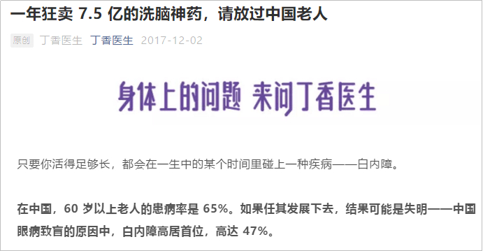 更可怕的是,白内障不严重时,其实可以通过简单的手术进行治疗。但莎普爱思等产品的广告营销之后,很多中老年人固执地相信一切,“模糊滴”“黑影滴”“重影滴”,就算“有点痛”,还要“坚持滴”。