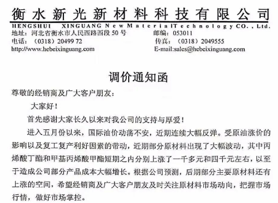 根据公开信息显示,今年5月18日,保立佳、衡水新光、广州罗斯夫等企业同日发布了产品调价通知,且给出的理由基本一致;上述发生在同一天的调价通知,是否是保立佳与另外两家企业协商一致后的举措,对此招股书并未作出披露。根据招股书披露,保立佳2019年在建筑乳液领域的市场占有率高达19.69%,如果再加上衡水新光、广州罗斯夫的市场份额,上述集中调价措施,是否涉嫌垄断?同样备受关注。
