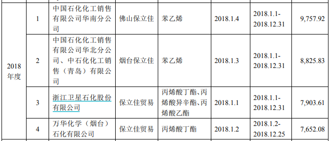 再来看保立佳的经营数据,根据招股书披露,卫星石化是保立佳2018年度第二大供应商,保立佳向其采购丙烯酸丁酯、丙烯酸乙酯、丙烯酸异辛酯等主要原材料,采购金额高达12,699.55万元;但与此同时,招股书第641页披露的重大采购合同信息显示,公司在2018年与卫星石化“年度实际交易金额”仅为7903.61万元,这与前文披露的同年向卫星石化采购金额相差巨大。