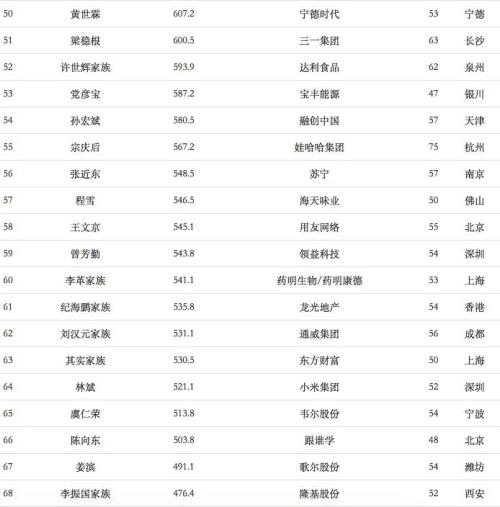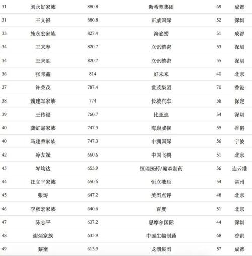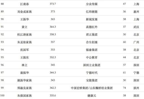 以下为福布斯中国富豪榜中排名前一百的富豪: