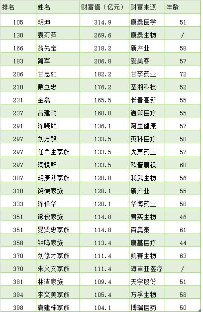 在新进榜单的富豪中,也有不少来自医疗行业,以下是医疗行业新晋富豪的完整榜单。