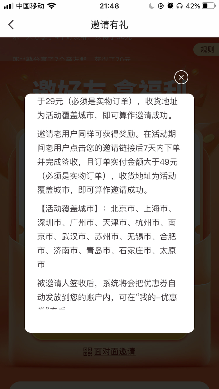 根据“邀请有礼”的主页面显示,其活动文案里还有一个“邀请小技巧”的提示,引导用户分享给身边更多的人及社群,却没有提及活动地区的问题。仅仅只有在右上角的“规则”按钮里点开才显示具体的活动规则。