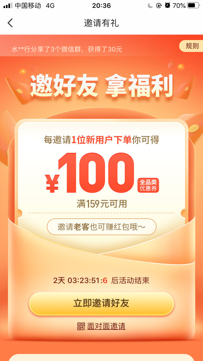 据“邀请有礼”的活动主页面上写明,每邀请1位新用户下单可获得100元全品类优惠券。此外,邀请老用户也可赚取红包。不过,刘可根据页面提示邀请了4名好友下单并签收,最终却只有200元的奖励。