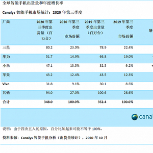 该季度,小米增速迅猛,较上年同期增长45%,出货量一举超苹果并开始追赶华为。需要指出的是,华为今年面临各种挑战,出货量大幅下滑,按当前节奏,就全球来说,小米有望实现对华为超越。值得一提的是,iPhone作为苹果核心产品,长期以来是核心收入来源,但全球市场受到三星、华为、小米等厂商挤压,尤其国内市场更是遭遇重创,销量不及本土手机厂商,根据苹果发布2020财年第四财季业绩显示,来自大中华区营收同比下降29%至79.5亿美元。