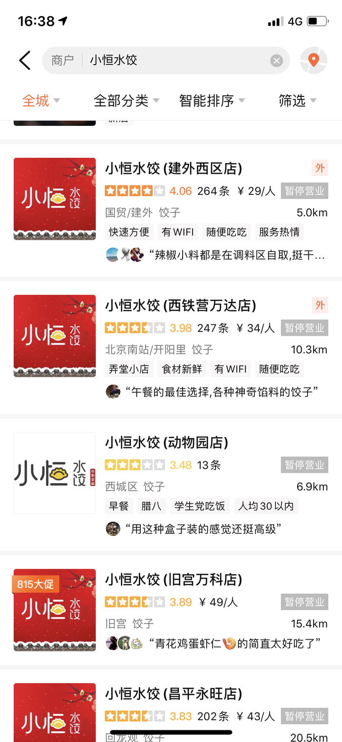 小恒水饺位于北京的多家门店在大众点评上显示“暂停营业”,而界面新闻记者进一步拨打其官网上的加盟热线,持续无人接听。