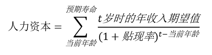 既然是一种资本,那么就存在如何计量的问题。根据上面的逻辑,人力资本是我们用来获得收入的基础。而在金融的话语体系里,我们说资产的定价,等于这个资产可以带来的所有现金流的现值之和。所以,任一时点的人力资本,等于未来所有收入的贴现值加总:
