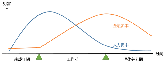 人的未成年期,就是人力资本的累积期。身体的成长,人格的健全,教育的投入,使我们拥有了一生创造价值的资本。在即将毕业、进入社会的一刻,我们的人力资本达到了一个高点。而在这一阶段,除了父母给的一些资金,自己兼职的零星收入外,我们的金融资本几乎为零。