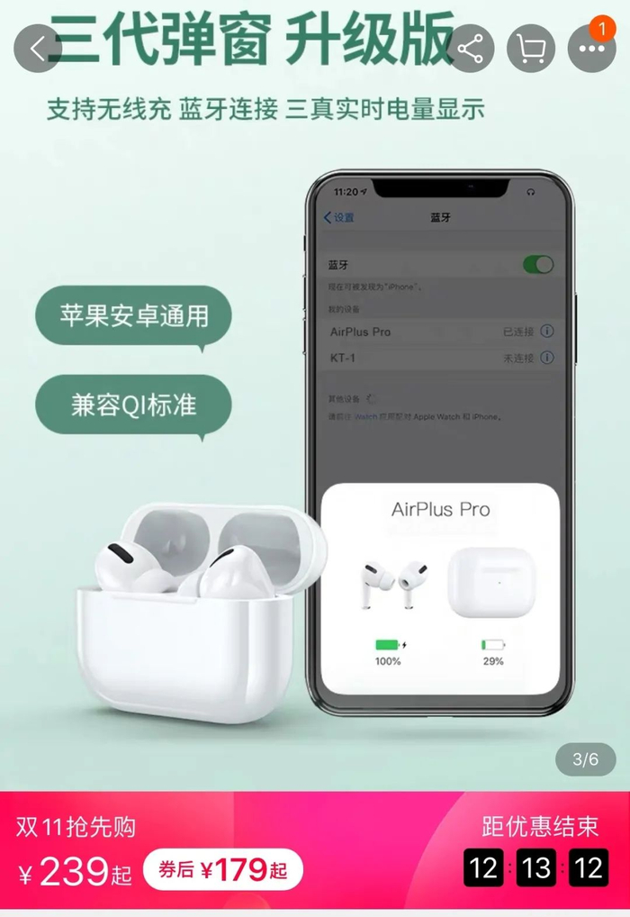 有的店家为了规避平台审核风险,还会采用与AirPods相似的英文名,比如AirPors、AirPros、AirPlus等等,不过换汤不换药,销售的产品其实也都是使用相同公模的山寨AirPods。