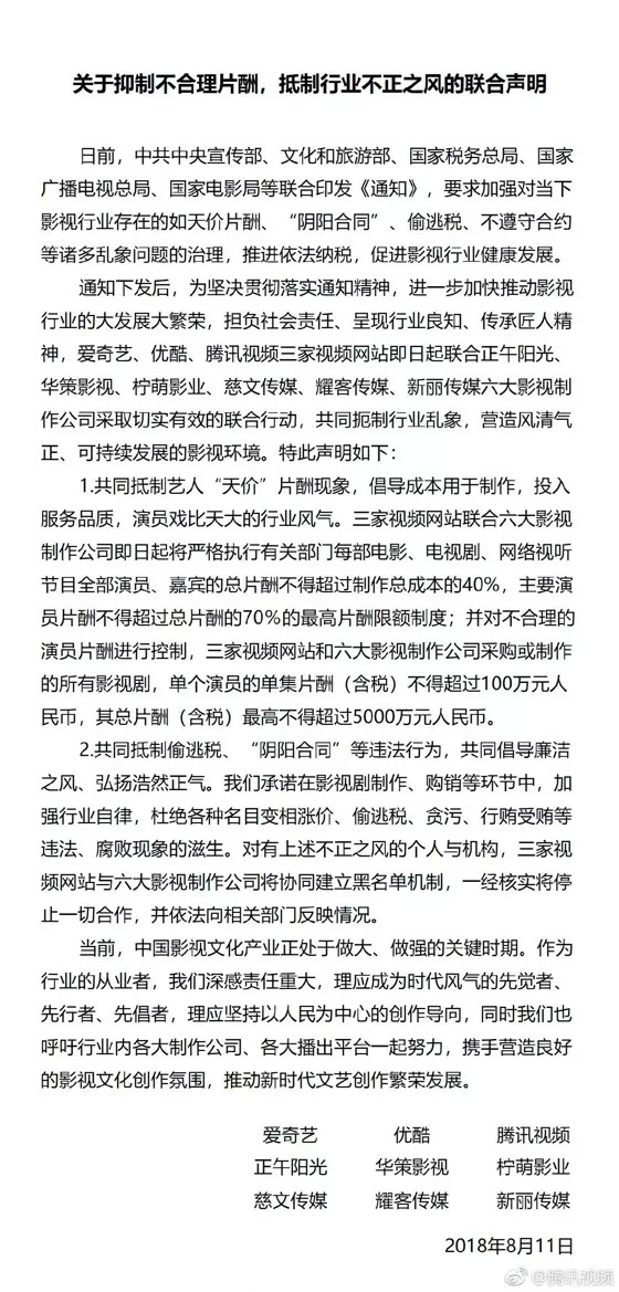 面对越来越夸张的片酬,2018年8月爱优腾牵头行业多家影视公司,发表限制不合理片酬的联合声明。到今年5月龚宇透露,现在播出的剧都已符合限定价格,基本片酬都控制在5000万以下。