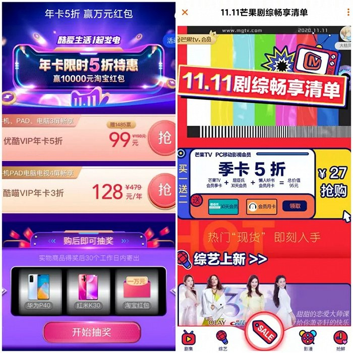 临近双十一,各平台今年全都跟进推出了促销活动,以5折甚至更低的折扣拿下并不难。芒果TV会员季卡买1送2项附加权益,优酷VIP年卡直接5折,酷喵VIP年卡仅3折,腾讯视频推出和网易云音乐的联合会员,月费才20元,额外赠送3次抽奖机会,爱奇艺早在夏天就推出了89元的VIP年卡,折扣力度低于5折。
