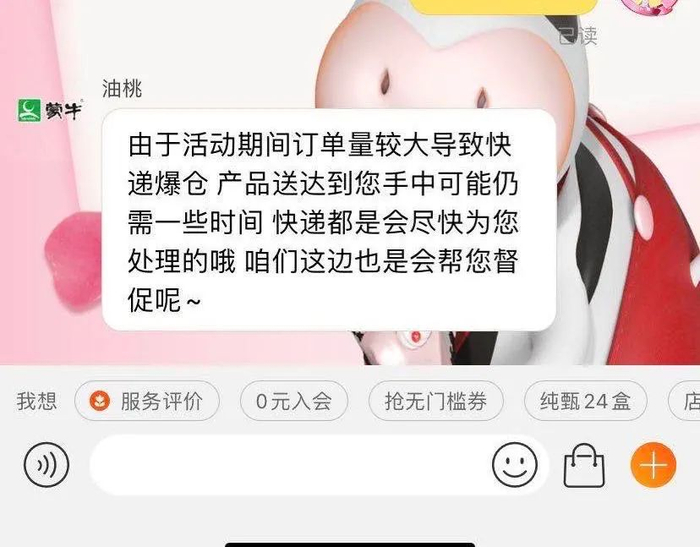 在北京CBD工作的“尾款人”王安(化名)没有等来物流信息纹丝未动的牛奶,先等来的了蒙牛客服的回应:由于活动期间订单量较大导致快递爆仓,产品送达您手中的时间可能仍需一些时间。