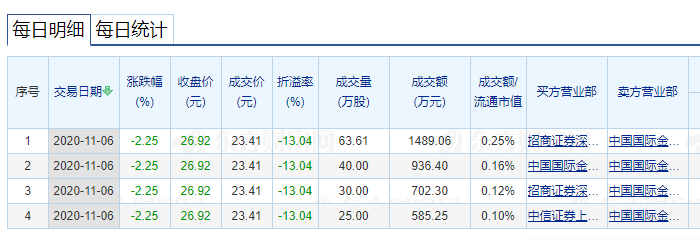 根据交易所公开信息,11月6日,长阳科技大宗交易成交158.61万股,成交价23.41元,折价13.04%。由于卖方营业部均为中金公司上海分公司,不排除是单一股东的大宗交易行为。