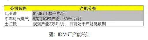 需要注意的是,由于IDM模式在提高产品毛利并建立技术壁垒上更有优势,从全球IGBT市场竞争格局来看,海外龙头以IDM为主,但国内仅有三家公司,各自产能如下图所示: