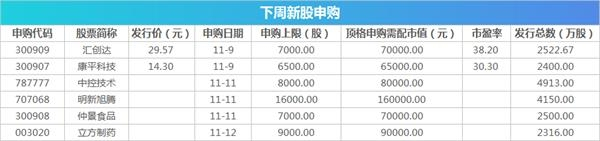 11月9日发行的是汇创达、康平科技;11月11日发行的是中控技术、明新旭腾、仲景食品;11月12日发行的是立方制药;这6只新股累计发行数量共计约1.88亿股。