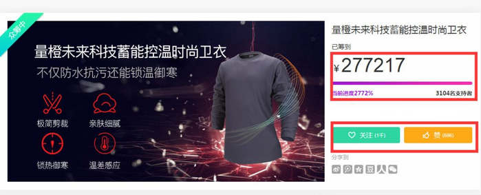 也许你会讶异,真的有这么神奇吗?不信的话,请看看数据,这款衣服已经火爆了!在京东众筹才过去短短一段时间,已经获得几千人的支持和关注,进度达到了2772%!