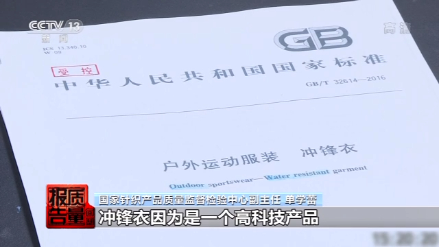 国家针织产品质量监督检验中心副主任单学蕾:冲锋衣因为它是一个高科技产品,它面料不同于往常面料,它既具有雨衣的防水性能,又得透气,那就增加了很多技术。要跟普通的服装分开,所以要执行不同标准,也就是你这个标准不能达到我这个标准,你不能叫冲锋衣,这些科技在里边,成本不能跟那个根本不具备这个功能的衣服卖一样的价钱,叫一样的名字。