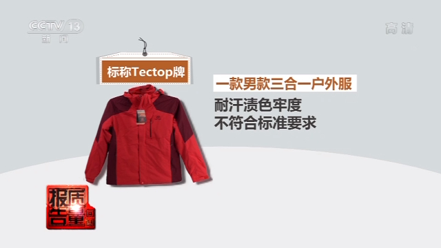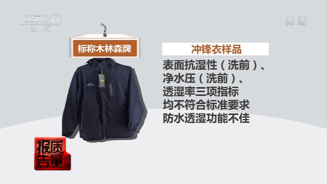 北京市消费者协会秘书长杨晓军:比如说我们这次测试了一个猛犸象牌的样品,网上说自己是冲锋衣,宣传了防风,防水等等这个功能。实际上标注的是男夹克,明示的执行标准是单夹服装的标准,这个标准里,根本就没有功能性的这个要求,按照冲锋衣的标准,实测这个样品的净水压,也就是防水性能比较差,但是如果有关部门抽检到这个产品,按照明示的这个单夹服装标准检测,他又是合格的,他实际上是避开了这个抽检的这种风险。