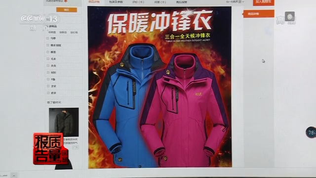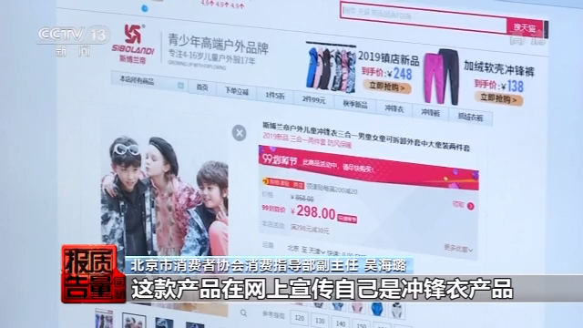 北京市消费者协会消费指导部副主任吴海璐:这款产品在网上宣传自己是冲锋衣产品,宣传了自己具有保暖、防水、透气、防风等功能。但是实际拿到手的样品,在吊牌上他宣传自己是冲锋衣,但是他执行标准却是一个普通服装的标准,经过我们测试,这个产品防水性能没有达到冲锋衣应该具备的防水效果,所以这个产品也涉嫌虚假宣传。