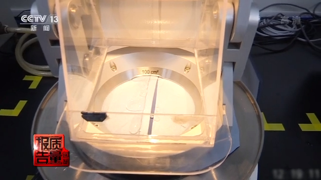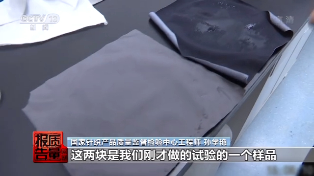 国家针织产品质量监督检验中心工程师 孙学艳:这两块是我们刚才做的实验的一个样品,灰色那块样品是表面抗湿性能非常好的,表面没有水珠也没有润湿,黑色那块样品的表面不仅有水珠还有大面积的润湿情况。这块黑色的样品按照我们这样卡评级,已经评到了一级。一级的话基本上就是一点表面抗湿性能都没有,就是非常差的一种产品。