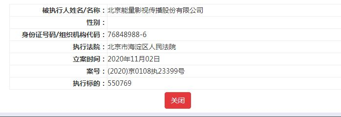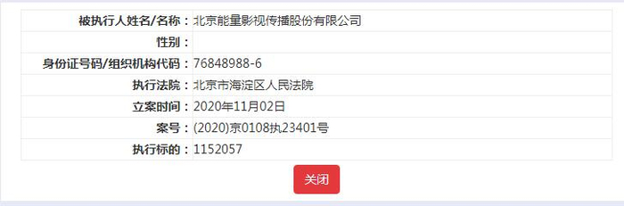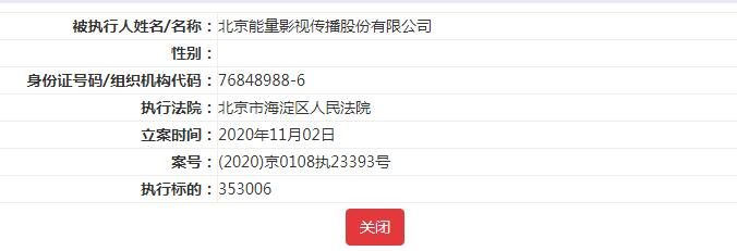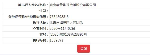 案号(2020)京0108执23401号显示,北京能量影视传播股份有限公司被北京市海淀区人民法院列为被执行人,立案时间2020年11月02日,执行标的1152057元。