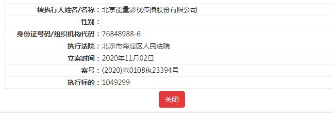案号(2020)京0108执23394号显示,北京能量影视传播股份有限公司被北京市海淀区人民法院列为被执行人,立案时间2020年11月02日,执行标的1049299元。