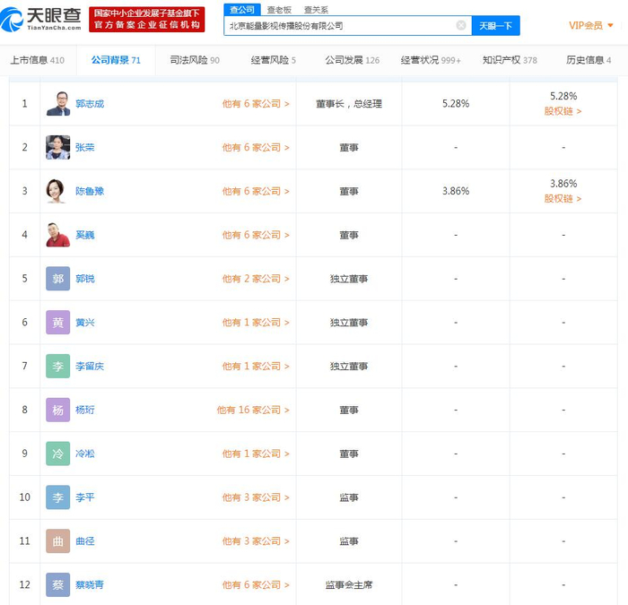 天眼查App十大股东信息显示,陈鲁豫任该公司董事,持股比例为3.86%。