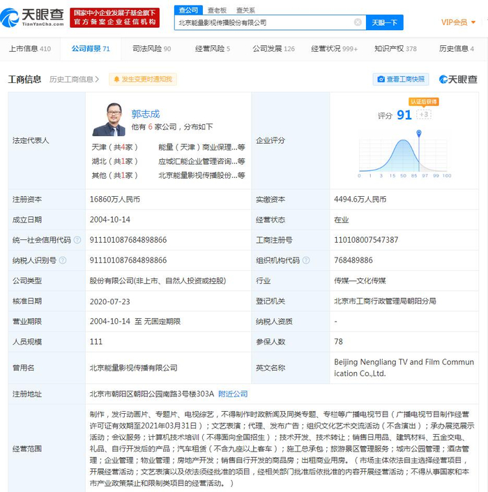 天眼查数据APP显示,北京能量影视传播股份有限公司成立于2004年10月,注册资本约16860万人民币,法定代表人为郭志成,经营范围包括制作,发行动画片、专题片、电视综艺,文艺表演,代理、发布广告等。