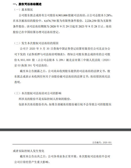 当天公告还称,公司于2020年9月30日查询中国证券登记结算有限责任公司北京分公司下发的《证券质押与司法冻结明细表》,得知公司股东郭志成持有的公司股份8903000 股(占公司总股本 5.28%)被北京市第三中级人民法院(2020)京03执保391号司法冻结。截至本公告披露之日,公司尚未收到股东提供的司法冻结的法律文书,股东郭志成表示未收到任何关于该股份被司法冻结的法律文书,冻结原因尚无法查明。