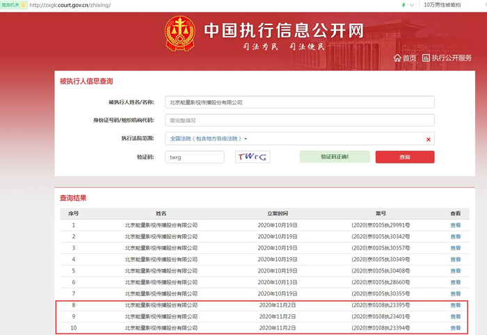 中新经纬客户端11月9日电 日前,中国执行信息公开网显示,北京能量影视传播股份有限公司被北京市海淀区人民法院多次列为被执行人,立案日期均为11月2日,执行标的共超446万。此前,该公司也多次被列为被执行人。