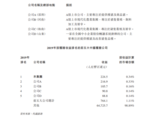 根据招股书引用的灼识咨询――一家为各行业公司上市融资提供顾问服务的第三方咨询机构的报告,就种猪销售收入而言,天兆2017-2019年在中国所有的种猪养殖公司当中分别排名第二、第四和第一。