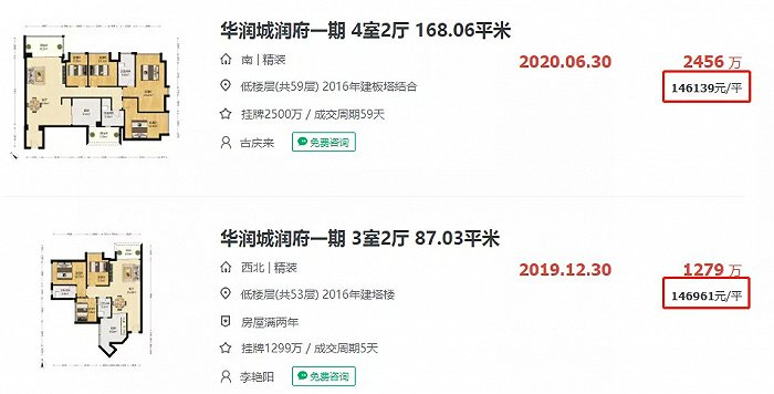 目前,据链家信息,华润城一到三期的参考均价在16.9-18.2万元/平方米区间。但平台上公开的信息中,只有14万元/平方米左右的成交记录。