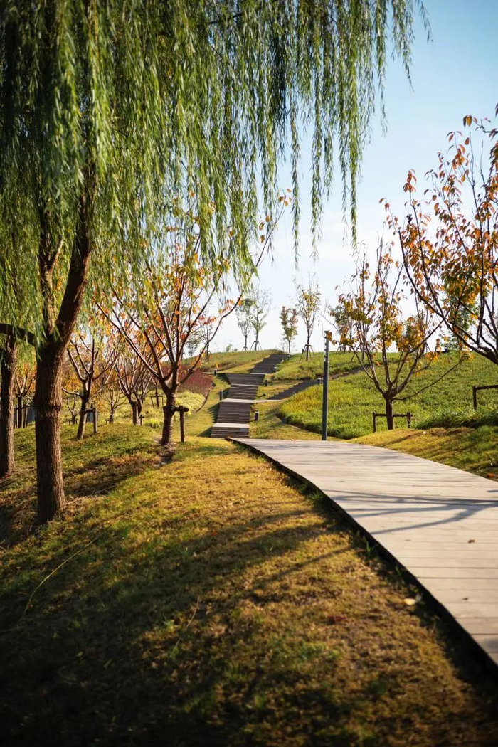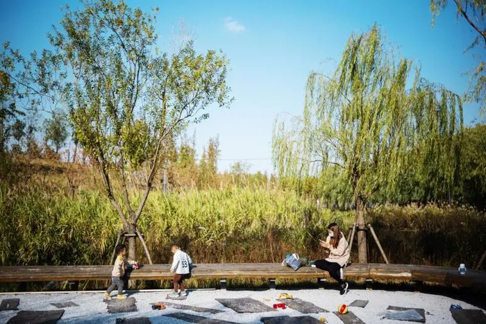 除了银杏大道附近的秋叶景观,绿地内大片的狼尾草也已抽穗,透出野趣。水边的小桥上,也设置了高低错落的供游客坐下赏景的台阶,适合放空发呆。路面的铺装设计则以书法中笔画的动势为灵感,通过6种不用灰度的组合搭配,形成富有变化、独具特色的渐变铺装,创造出空间的流动感。
