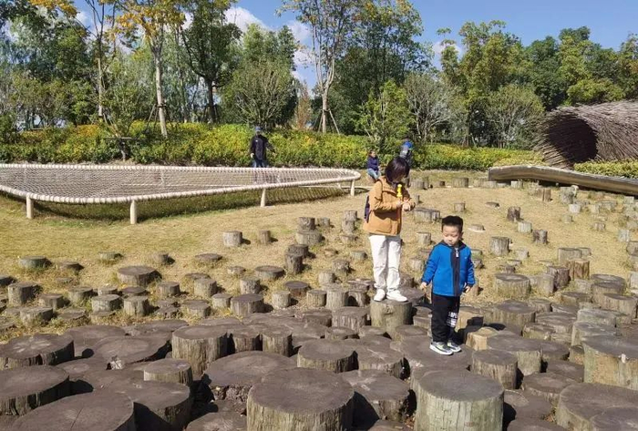 绿地内最“网红”的区域,当属由蹦床、树桩、竹制毛毛虫隧道、铁质滑梯等组成的儿童游乐区。即使是工作日的上午,这里也有不少跟着家长来休闲的孩子,他们在高高低低的树桩上跳上跳下,在光影斑驳的“毛毛虫隧道”里奔跑,玩得不亦乐乎。