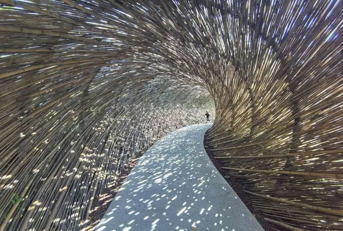 这些高高低低的树桩,其实是座椅,座椅前有一个小小的舞台,可以上演各种有趣的节目和活动。由来自安吉的竹子编织而成的“毛毛虫隧道”,则是一个令人忍不住举起手机留影的地方。千千万万根竹子组合而成的隧道,外形像一只灰色的毛毛虫,隧道内的空间却堪称梦幻:透过层层叠叠的竹枝,秋日的阳光洒落在地面上,形成了星星点点的光斑,来到这里的游客几乎都会在此停留拍照。这条隧道落地的过程中,特地邀请了安吉当地中国主编工艺的匠人进行手工编制,并反复试验调整了孔隙大小和结构,才达到了现在这样美丽的光影效果。