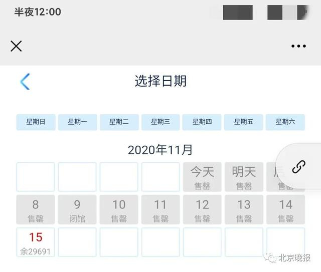 11月4日,进入“故宫博物院观众服务”微信平台,提前10天发售的门票均已“售罄”。故宫门票“上新”时间为每晚零时,11月5日零时,记者再次进入该平台,发现11月15日的余票有29691张,但只过了6分钟,余票就被抢购一空。不少游客感叹,预约故宫门票堪比“双十一”抢货。
