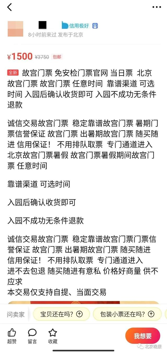 故宫官网上一张大门票售价为40元,网上却有卖家将无需绑定身份信息的嘉宾票卖到了上千元。