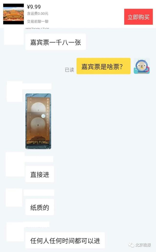 另一卖家手中,嘉宾票,即“丹宸永固 紫禁城建成六百年”的请柬已卖到1800元,他还提供了两张请柬的照片,并承诺任何人、任何时间都可以进院参观,参观者需携带身份证,但无需提前绑定,参观内容和普通预约买票进入相同。
