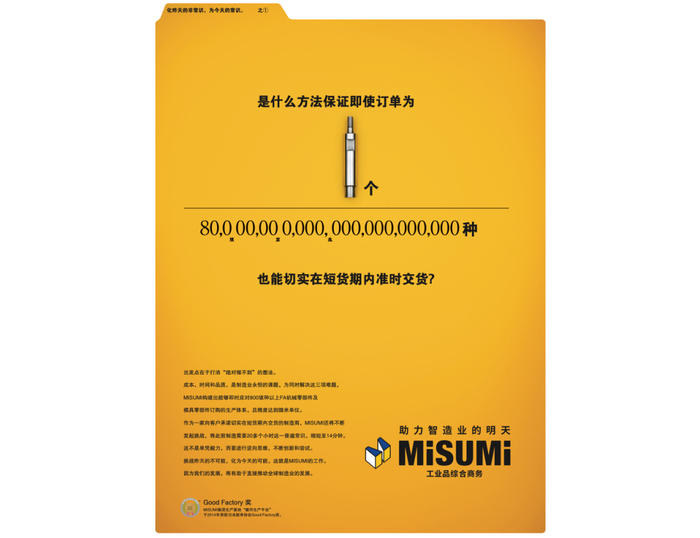 在米思米,我还学到了一个之前不了解的计量单位——垓,它在古汉文中指一万万兆,米思米所经营的商品数高达800垓,即80000000000000000000000(希望我没漏掉一个0)。如此天文数字般的商品量,它居然能做到一个起订,而且,当天下单、最快当天发货。