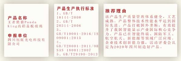 近日,中央广播电视总台央广网-四川频道、中央广播电视总台央广网-视听四川、四川经济网、川经嘹望技术创新四川信息网、四川企联网共同发布“2020年四川制造好产品推荐名单”信息,东旭光电旗下四川旭虹光电科技有限公司王者熊猫高铝盖板玻璃凭借产品生产质量管理体系健全,工艺成熟;产品整体技术性能达到国际先进水平;产品打破国外垄断,有效提升了我国智能显示产业国际核心竞争力;产品已在智能终端、国防军工、航空航天、等领域广泛应用等方面的突出贡献,经四川省级院组织专家进行评审,被活动评委会认定为2020年四川制造好产品。