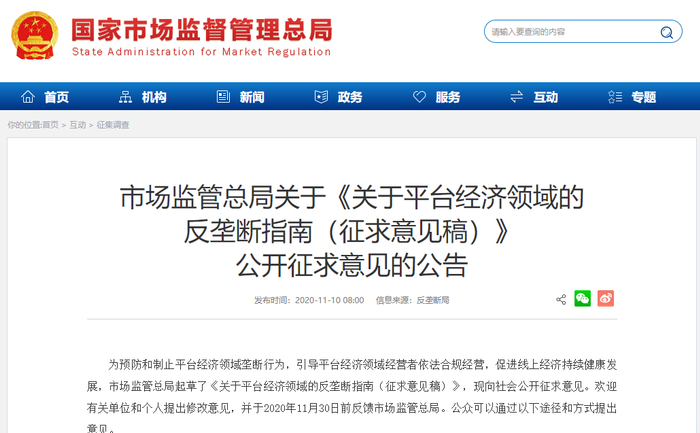 11月10日早8点,市场监管总局发布《关于平台经济领域的反垄断指南(征求意见稿)》公开征求意见的公告。这是近期市场监管总局已经公布了《经营者集中审查暂行规定》《规范促销行为暂行规定》《关于加强网络直播营销活动监管的指导意见》之后,对于互联网平台企业加强监管的又一重磅文件。