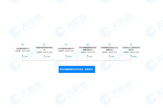 星盟信息共有七家股东,大股东为北京松联科技有限公司(松联科技),认缴金额5.2亿元,持股37.77%;其次为北京普天太力通信技术有限公司(普天),认缴金额5亿元,持股36.32%;中国邮电器材集团有限公司(中邮器材)持股21.79%,认缴金额3亿元;共青城酷桂投资合伙企业(有限公司)持股2.18%,认缴金额3000万元;天音通信有限公司持股1.74%,认缴金额2400万元;深圳市鲲鹏展翼股权投资管理有限公司持股0.2%,认缴金额278万元。其中深圳市鲲鹏展翼股权投资管理有限公司担任执行事务合伙人。