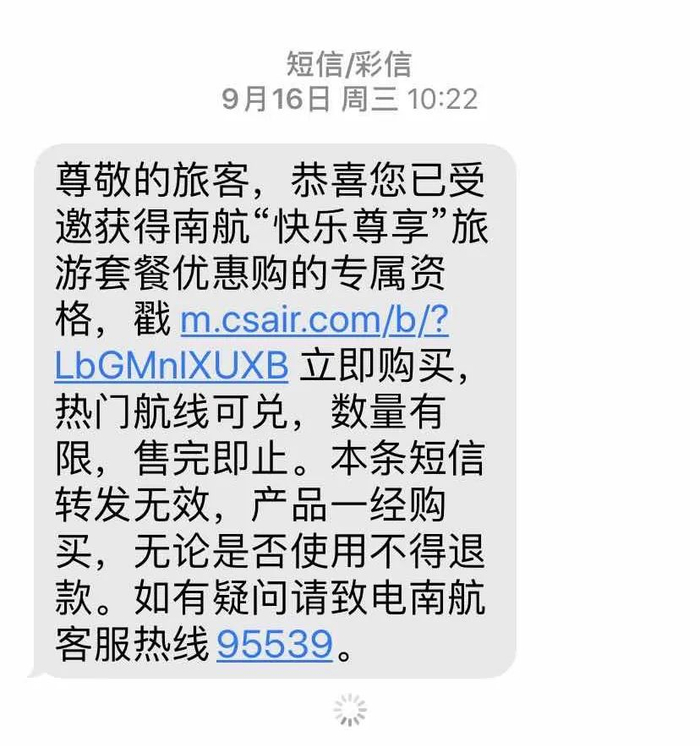 9月下旬,蒋女士在偶然的机会下听到朋友说起南航快乐飞,她产生了购买兴趣。于是蒋女士让朋友通过发短信的方式进行邀约,随后朋友便给她发送了如下的邀约短信。